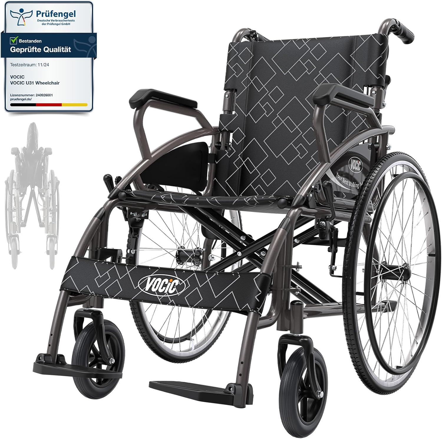 Die VOCIC Transport-Rollstuhl bietet stabile Leistung und unterstützt Ihre Unabhängigkeit, sodass Sie einen aktiven und gesunden Lebensstil führen können.