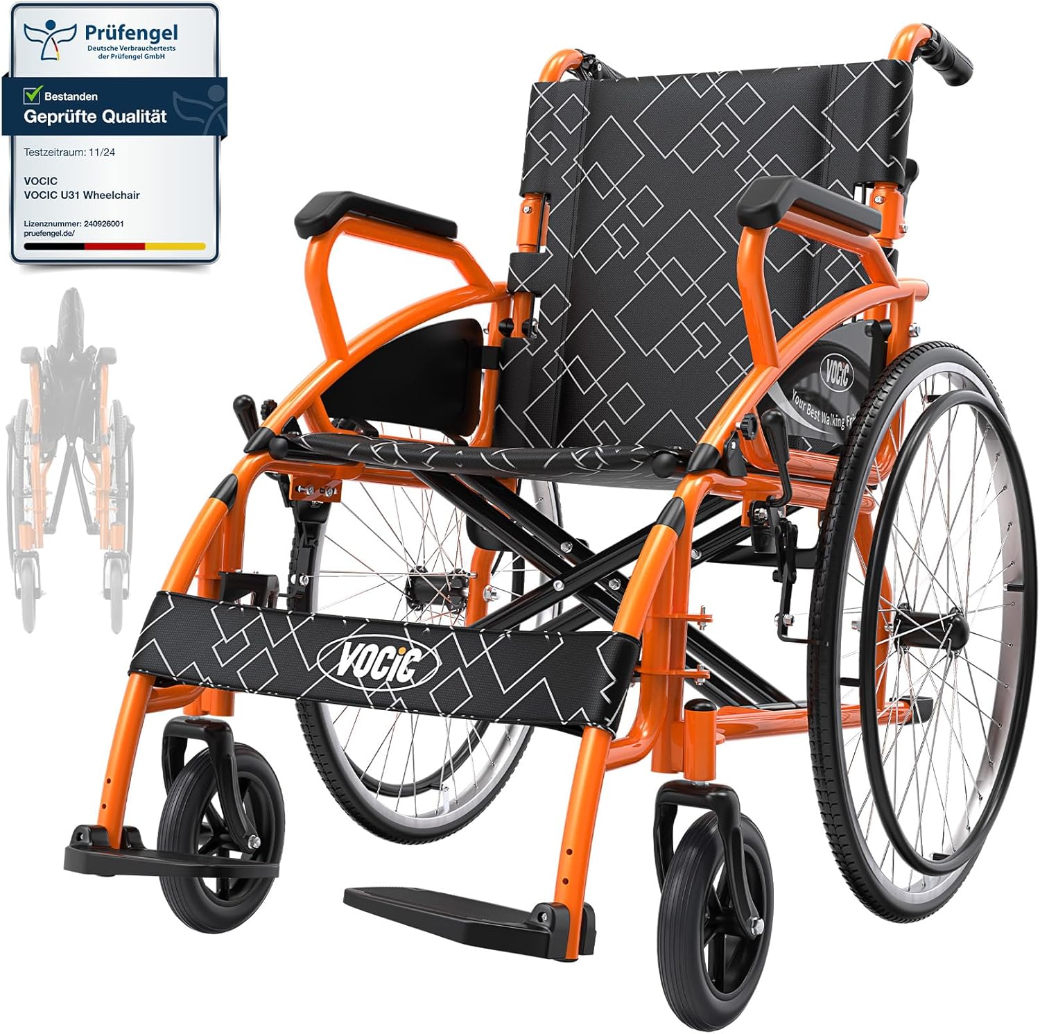 Der VOCIC U31 ist ein leichter, faltbarer Rollstuhl mit robuster Doppelbremse, ideal für den sicheren Gebrauch im Alltag oder unterwegs.