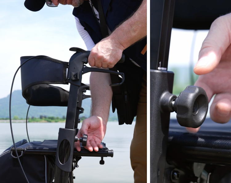 Der ergonomische Griff bietet festen Halt für maximalen Komfort. Ziehen Sie die Handbremse an, um beim Vorwärtsgehen langsamer zu werden oder anzuhalten, und drücken Sie sie nach unten, um die Räder zu blockieren und die Feststellbremse zu aktivieren, bevor Sie sich zum Ausruhen hinsetzen.