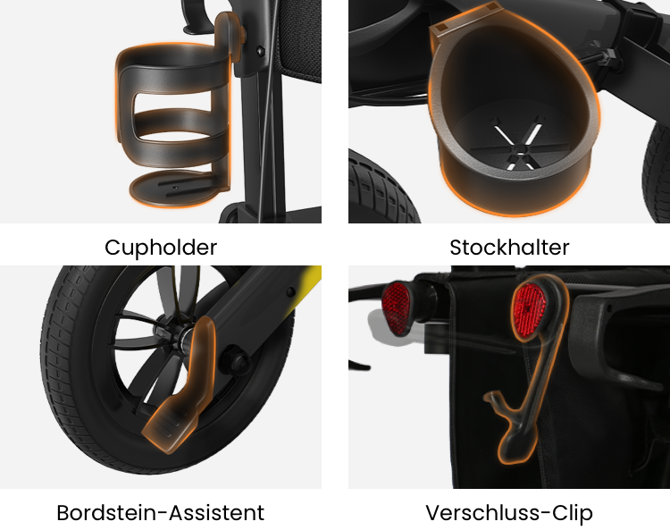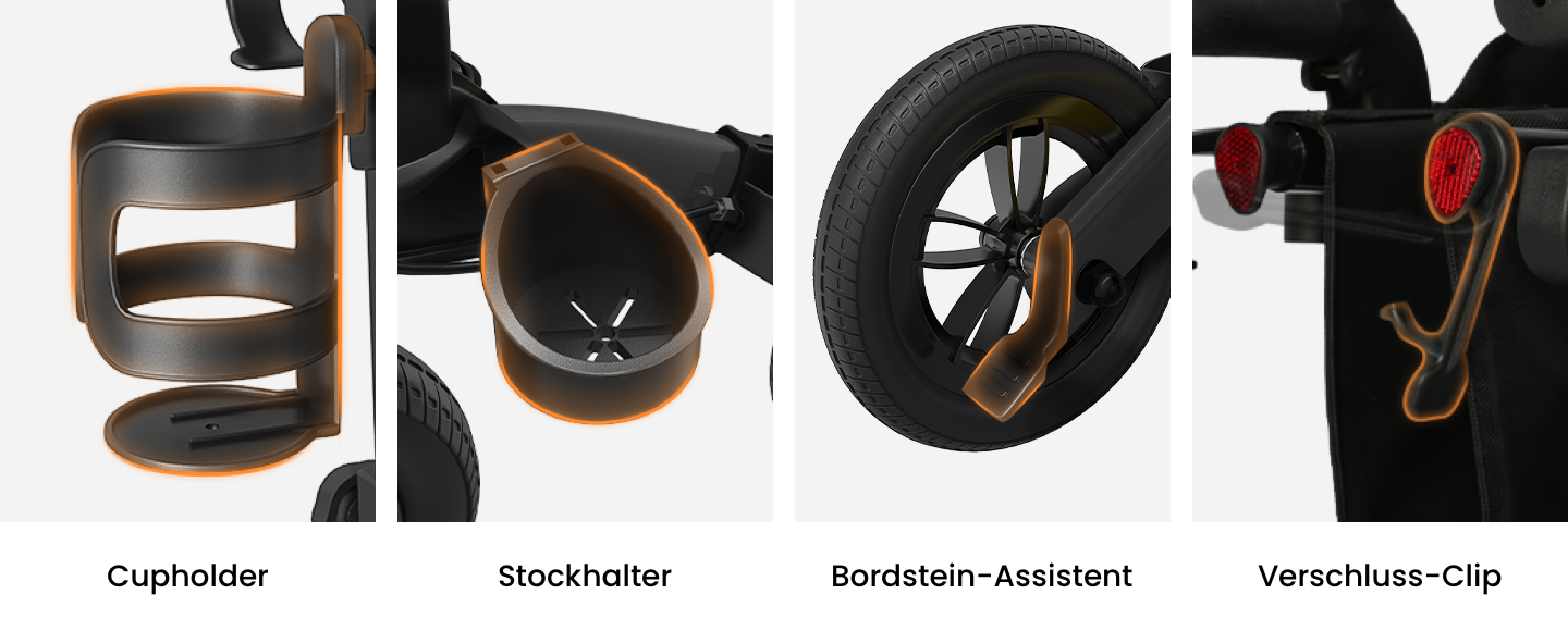 Ausgestattet mit Wasserbecherhaltern und Stockhaltern, die Ihre Reise bequemer machen. Aufbewahrungstasche mit Schultergurt ist abnehmbar. Sie lässt sich leicht zum Einkaufen mitnehmen. Wir verschenken eine Transporttasche, die Sie bequem verstauen können. Der Rollator mit Non-luftbereifung ist grundsätzlich vormontiert, was Ihnen den Aufwand bei der Installation erspart.