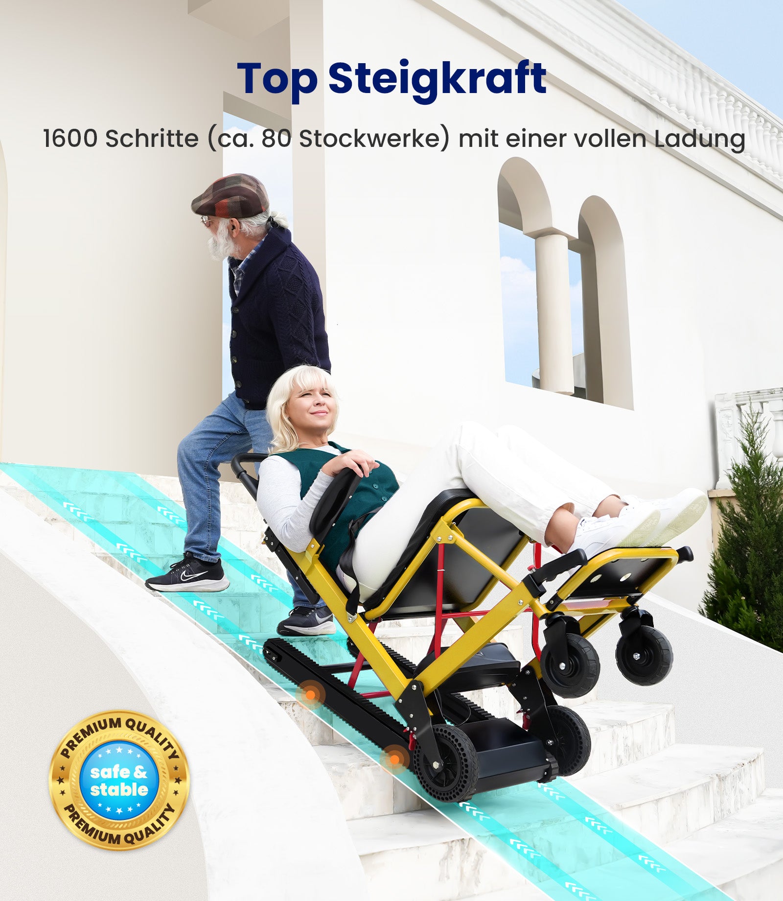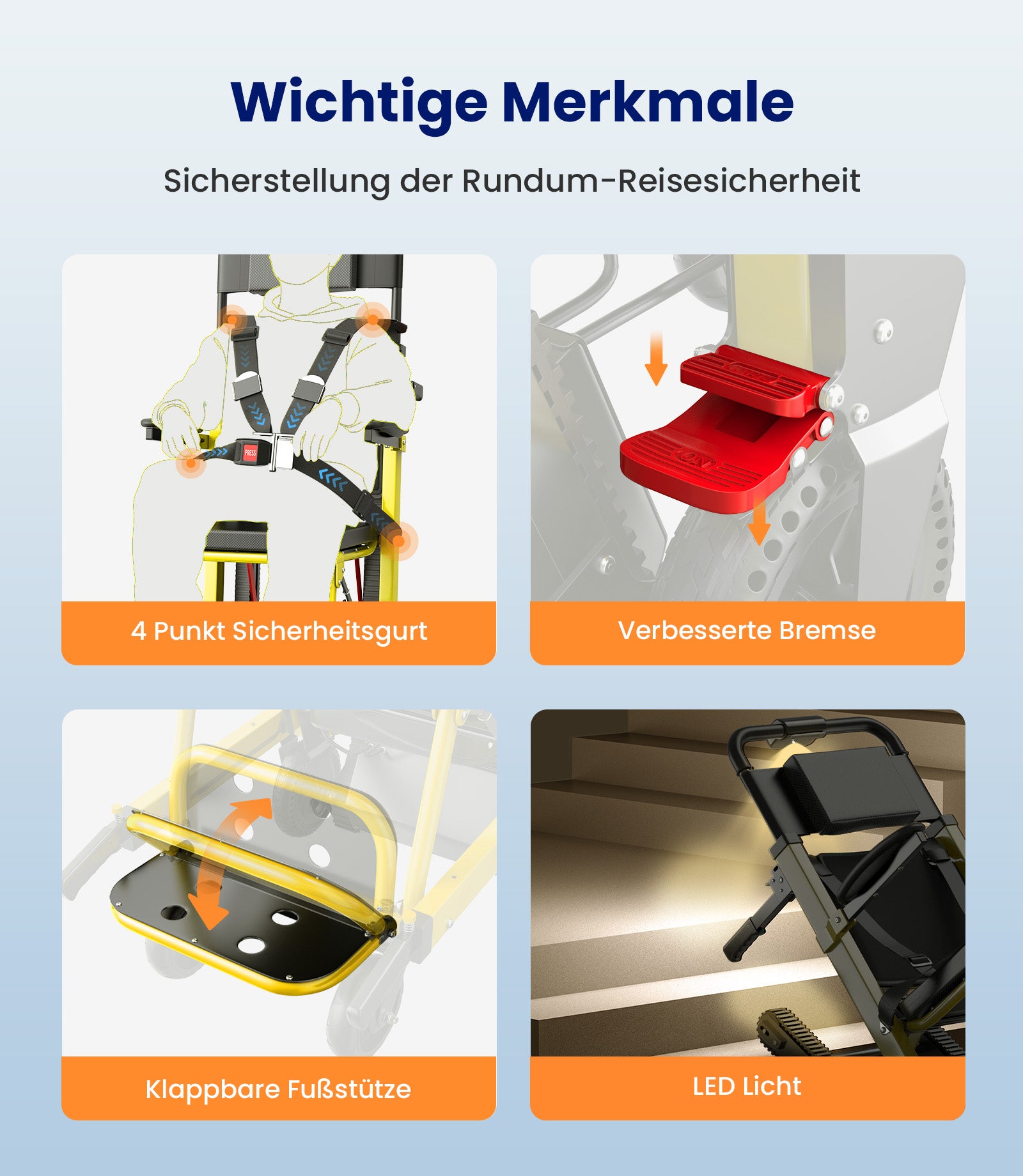 【Robuste Gummiketten】Der elektrische Treppensteiger ist mit speziell entwickelten Gummiketten ausgestattet, die für maximale Sicherheit beim Treppensteigen sorgen. Das hochwertige Material garantiert starke Bodenhaftung und hohe Verschleißfestigkeit. Angetrieben von einem 120W Motor und einer 24V/13Ah Batterie schafft er bis zu 1600 Stufen (ca. 80 Etagen) mit nur einer Ladung